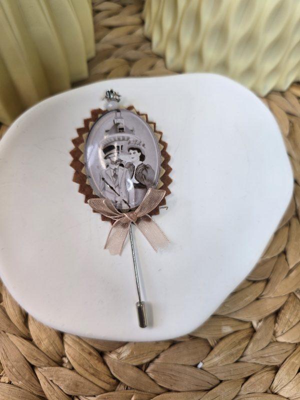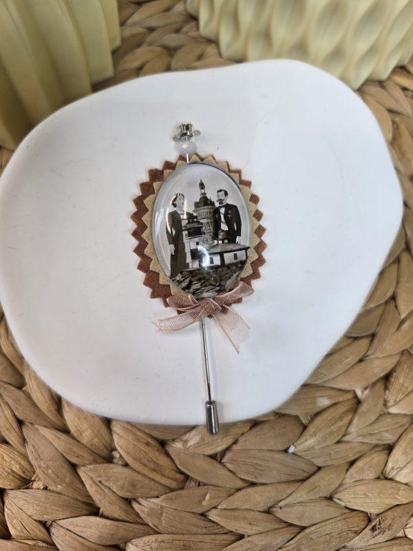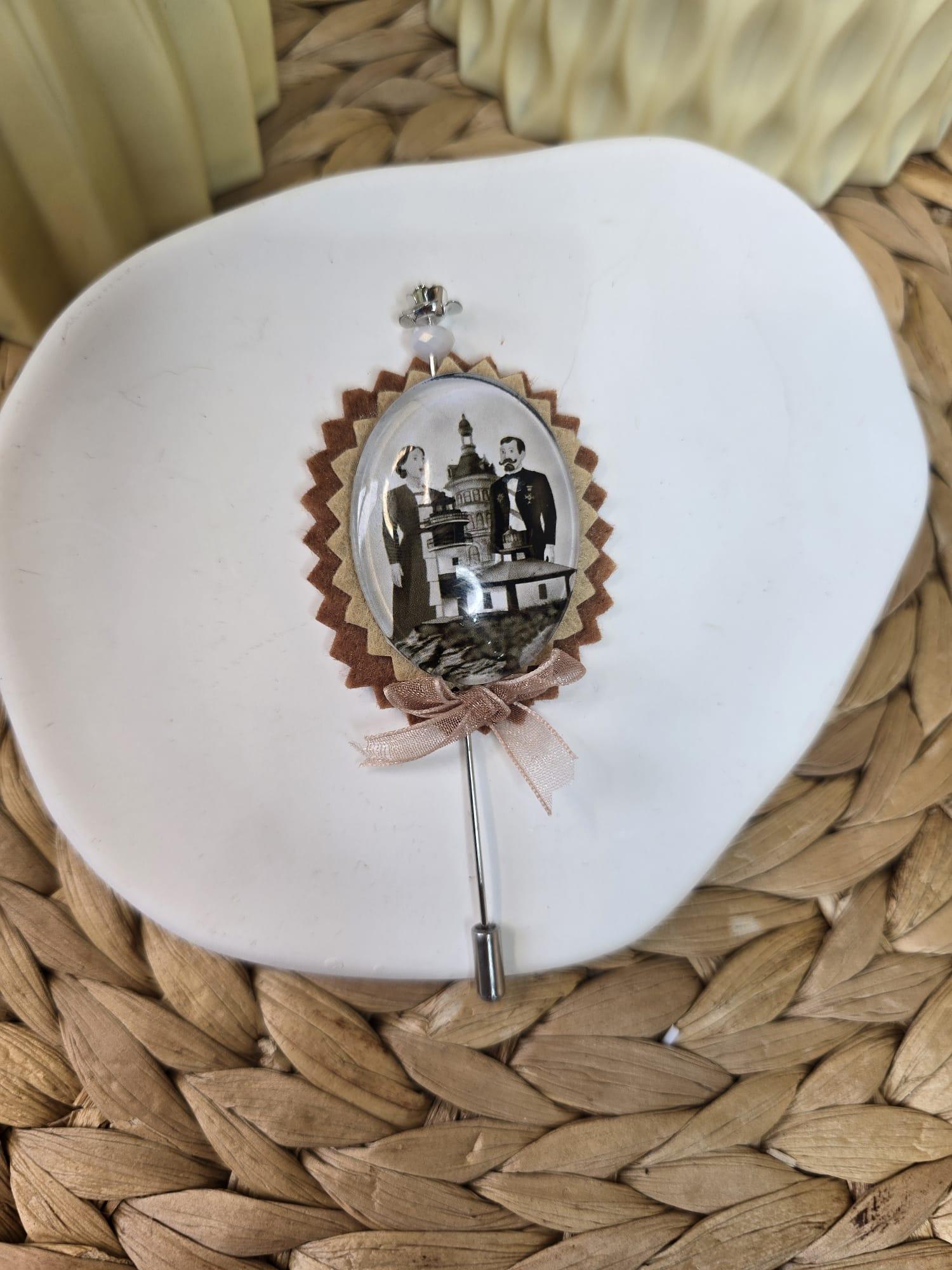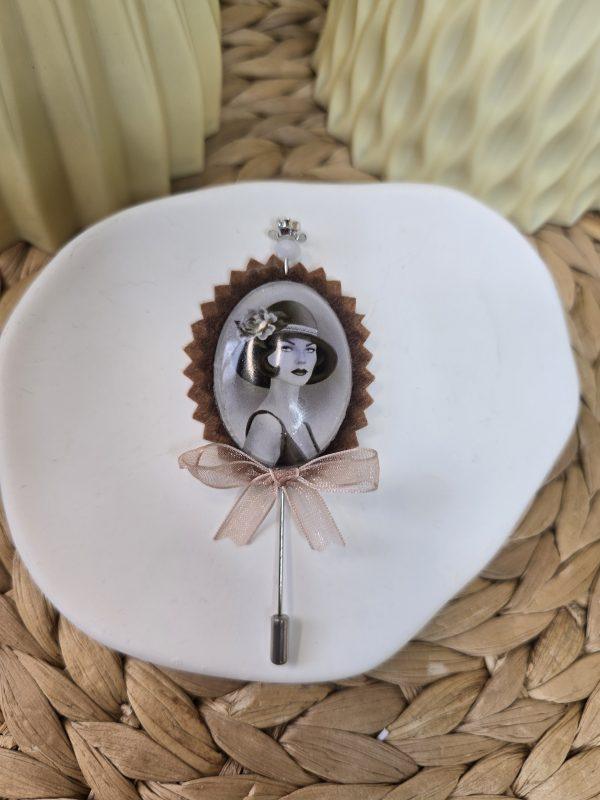 Alfiler realizada en fieltro y con cabujón de resina de 30 x 40 mm