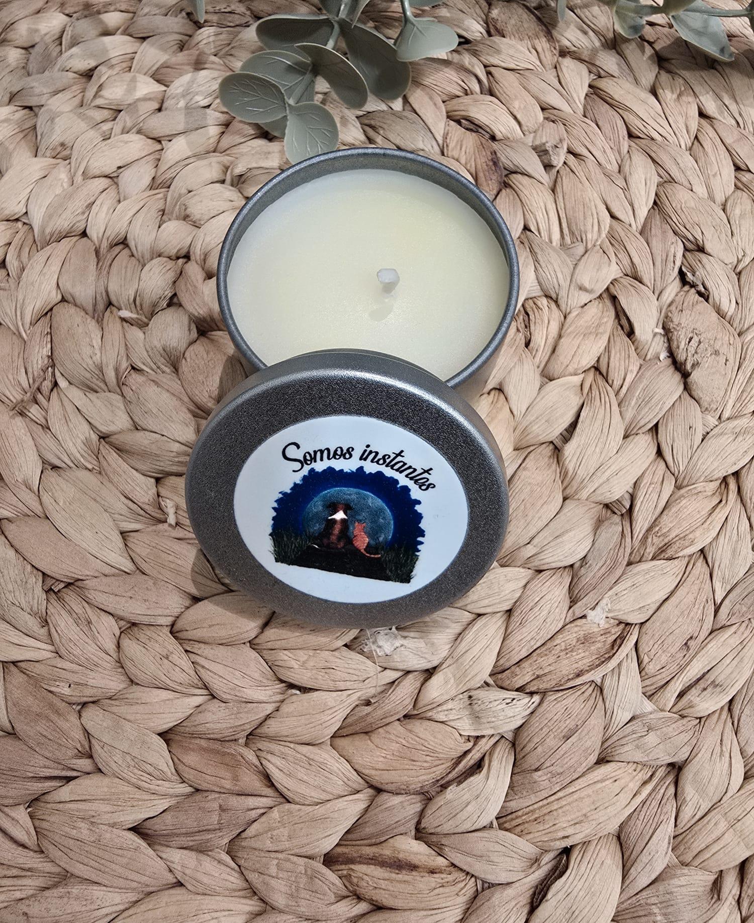 Vela aromática en recipiente metálico redondo de color metalizado.