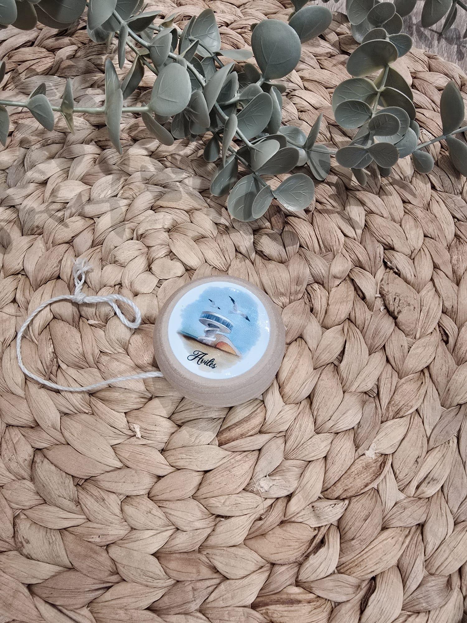Yoyo fabricado en madera con cuerda blanca.